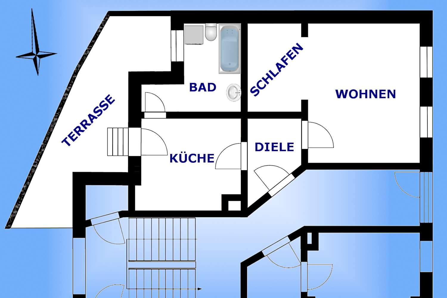 Wohnzimmer mit offener Schlafnische, Küche mit Zugang zur Terrasse, Diele, Bad/WC mit Wanne und Tageslicht.