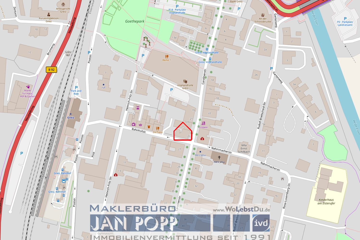 Die Gewerberäume befinden sich im Erdgeschoß eines Eckgebäudes der Carolinenstraße der Greizer Neustadt.