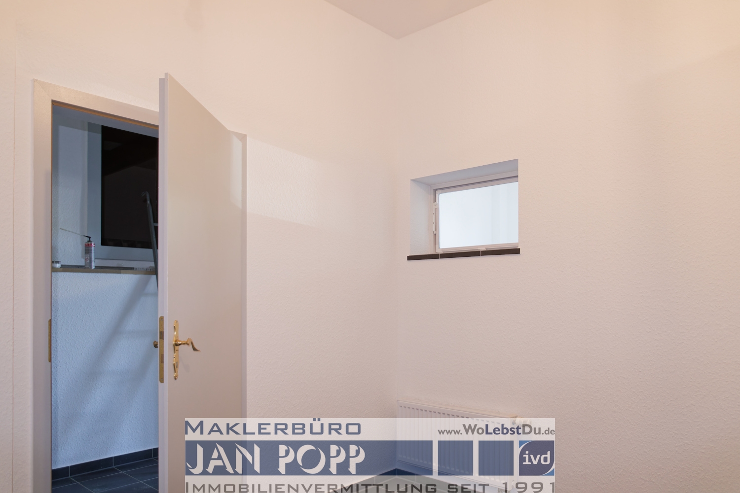 Die Küche ist ein Durchgangszimmer zum Bad und wird von dort durch Oberlichter und vom WZ durch ein Fenster mit Tageslicht versorgt. Im Flur führt eine Leiter in einen großen Abstellraum mit niedriger Decke und ohne Tageslicht, welcher nicht zur Wohnfläche gehört und kostenneutral ist, jedoch z.B. als Hobbyraum oder Staufläche genutzt werden könnte.