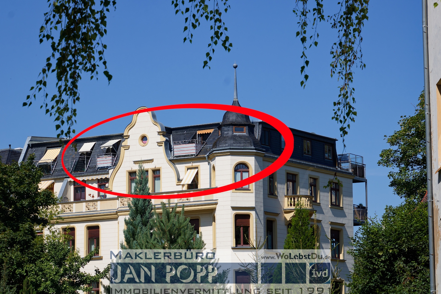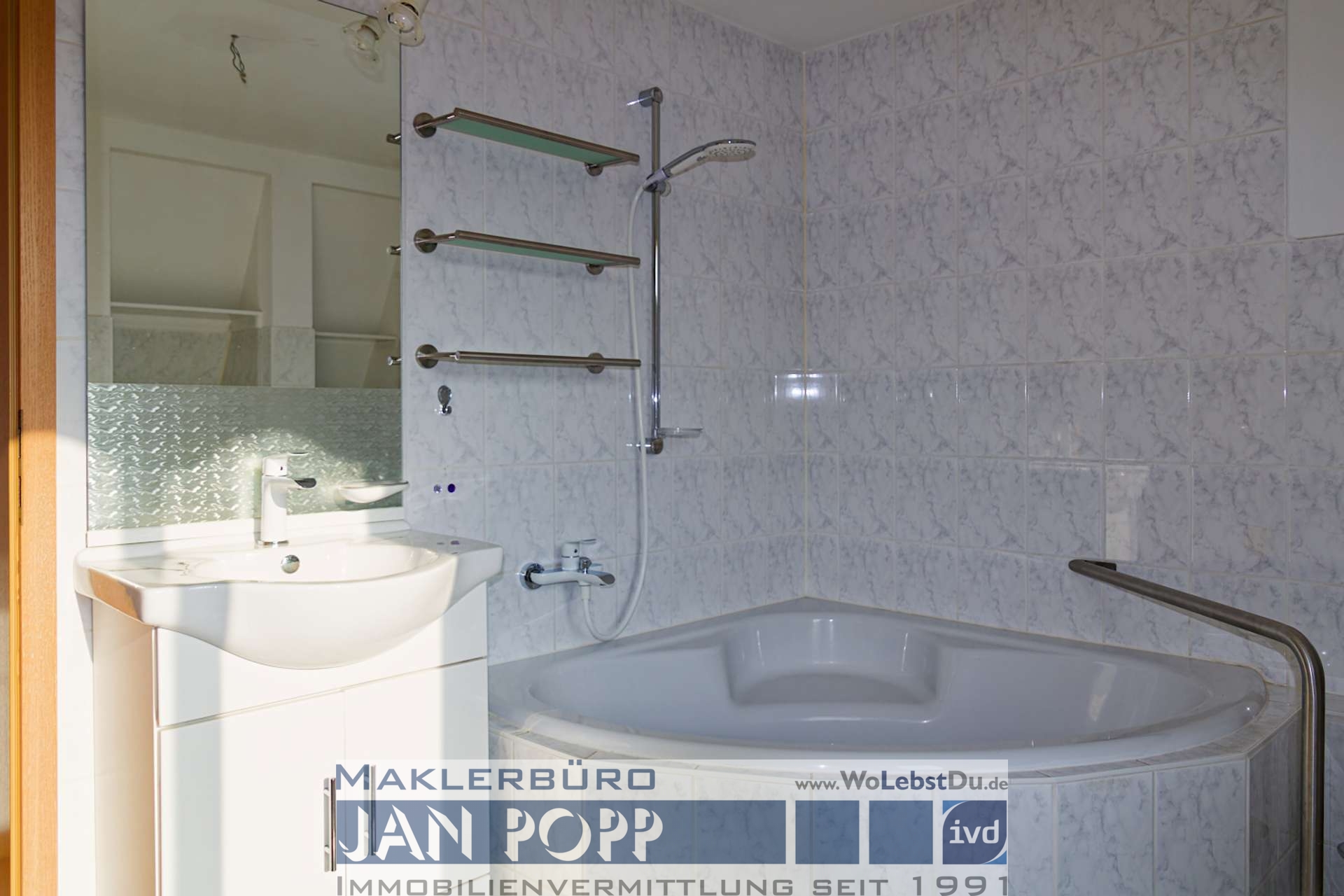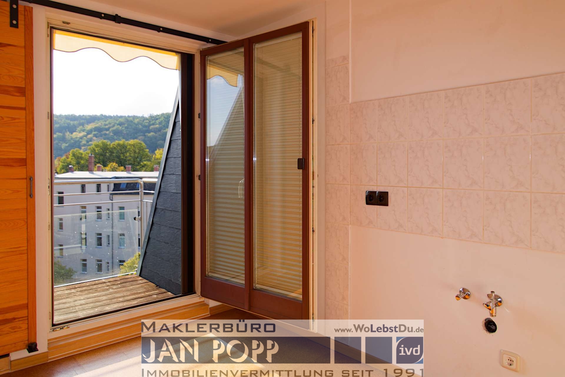 Sie verfügt über 2 Zimmer, Küche, Bad/WC mit Eckbadewanne und Tageslicht, einen Erker und drei kleine Balkone nach Südwest.