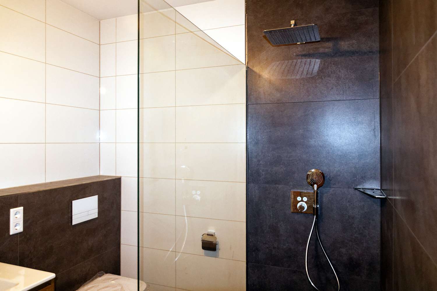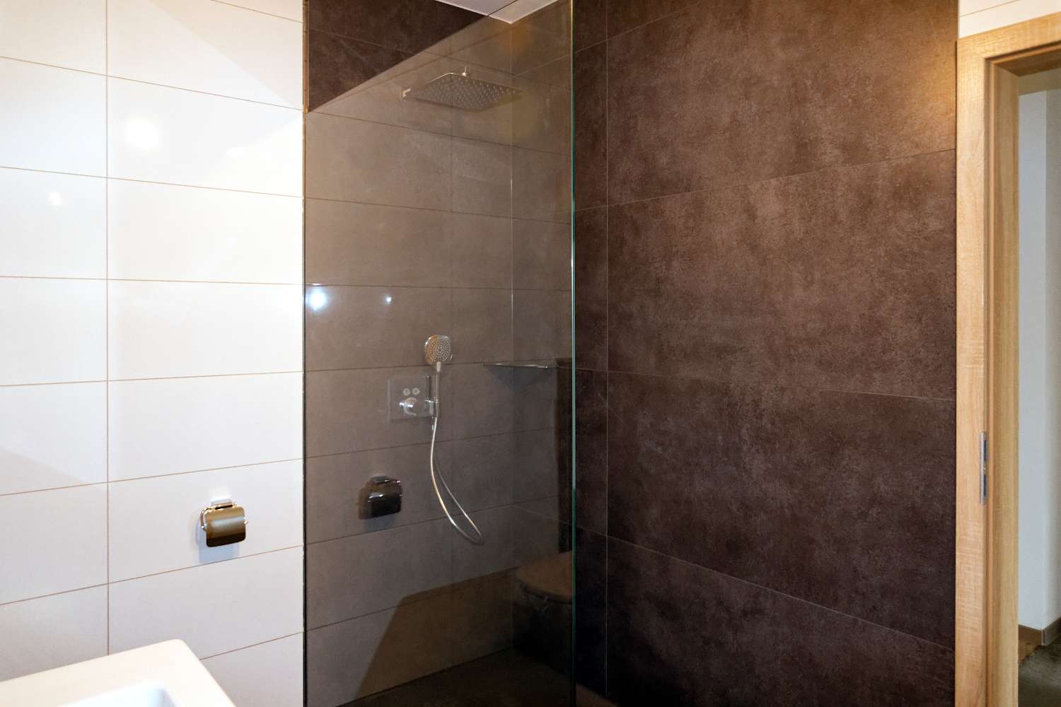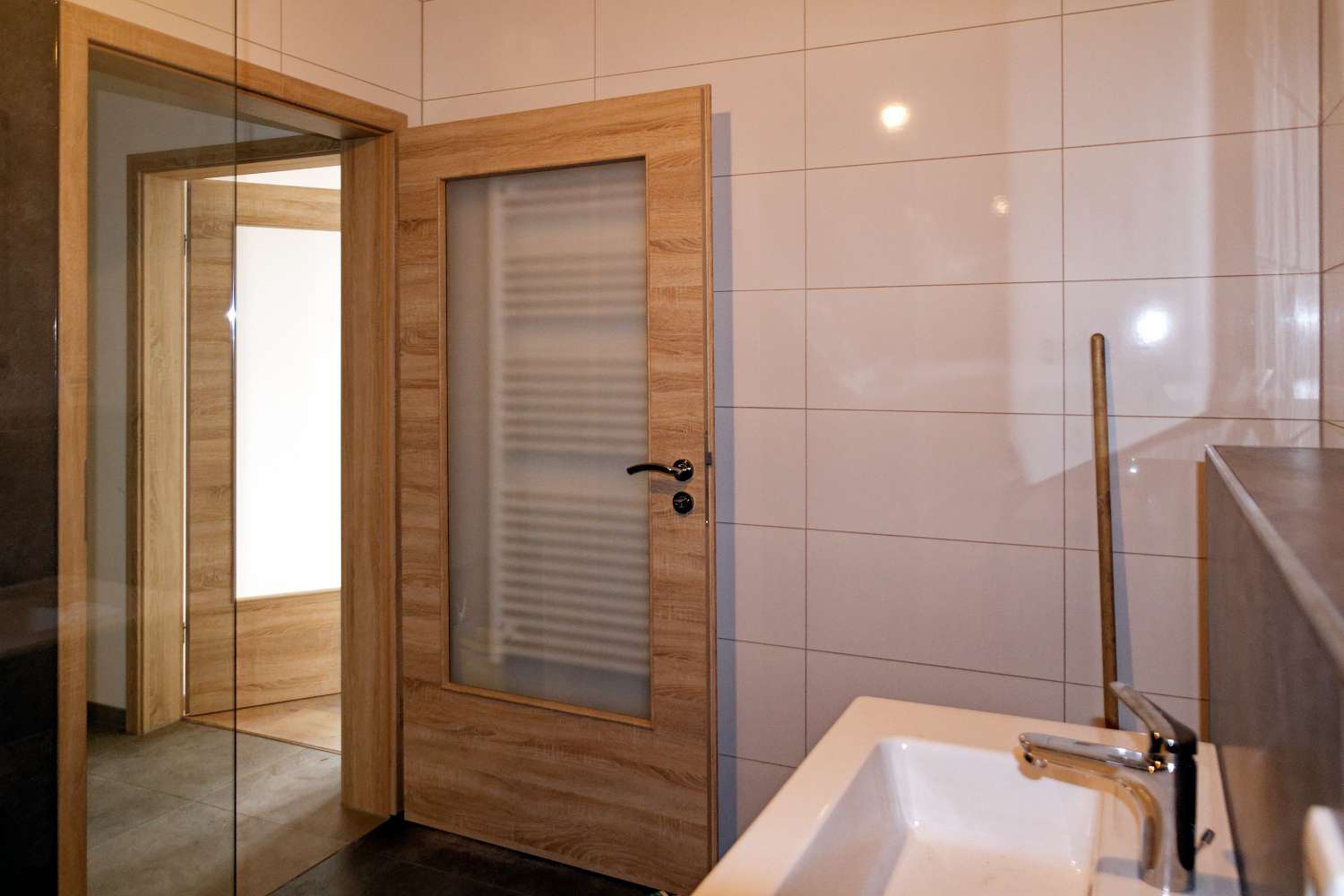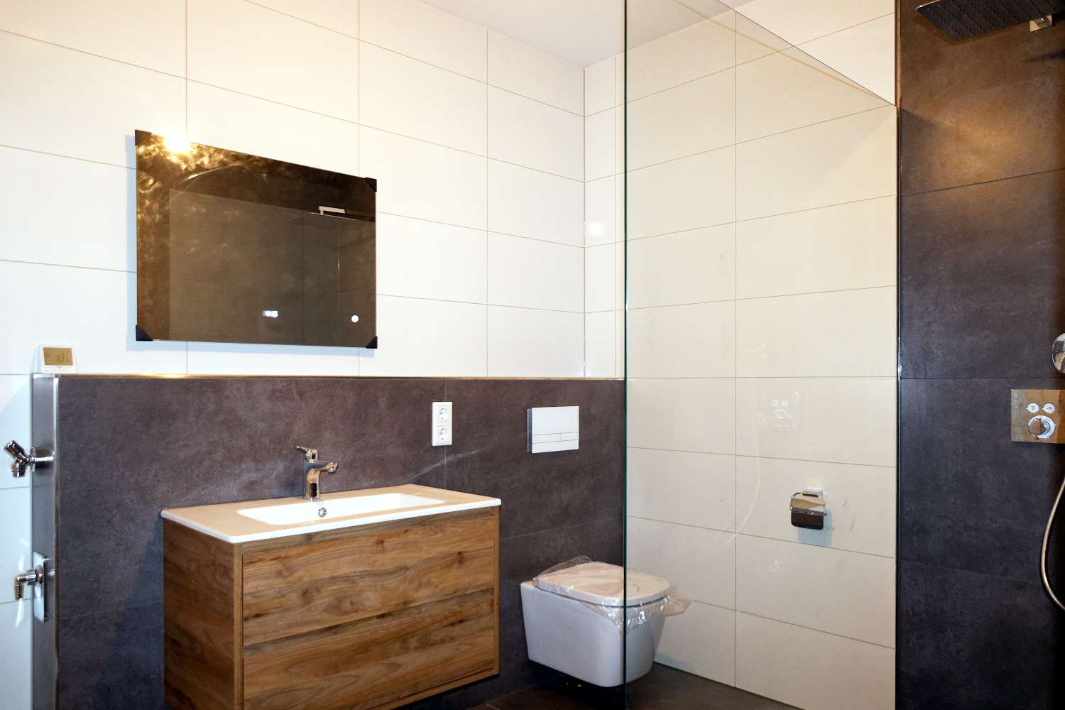 Auf der Fußbodenheizung wurde im Wohnbereich Echtholzparkett verlegt, Küche und Bad sind gefliest. Das moderne, innenliegende Badezimmer verfügt über eine Duschkabine, WC, sowie einen Waschtisch mit Unterschrank und beleuchteten Spiegel.