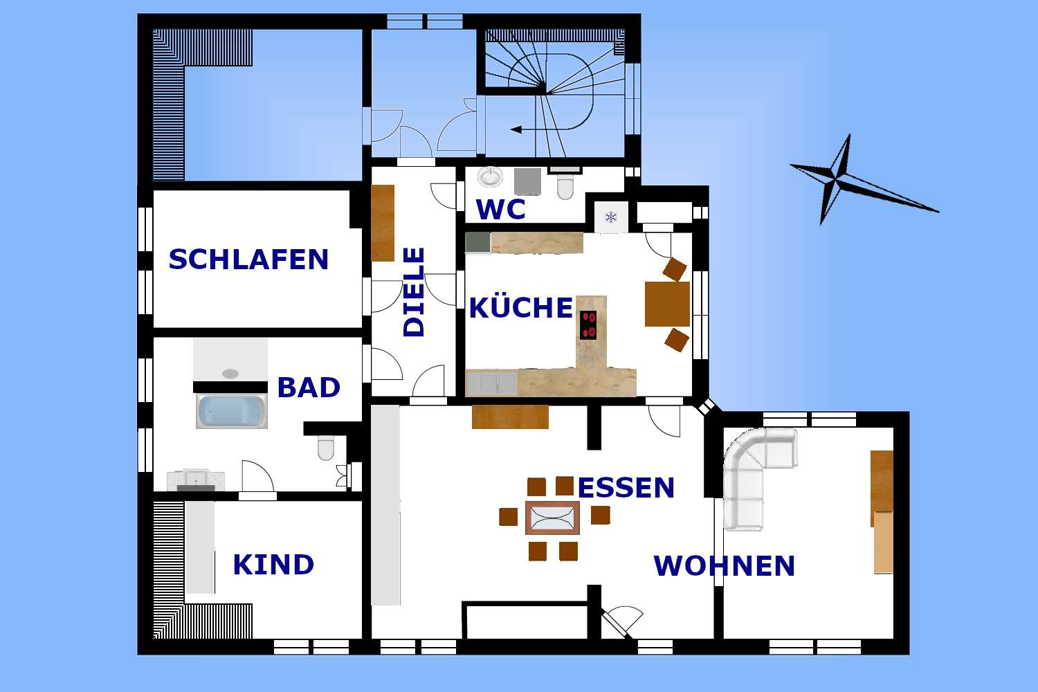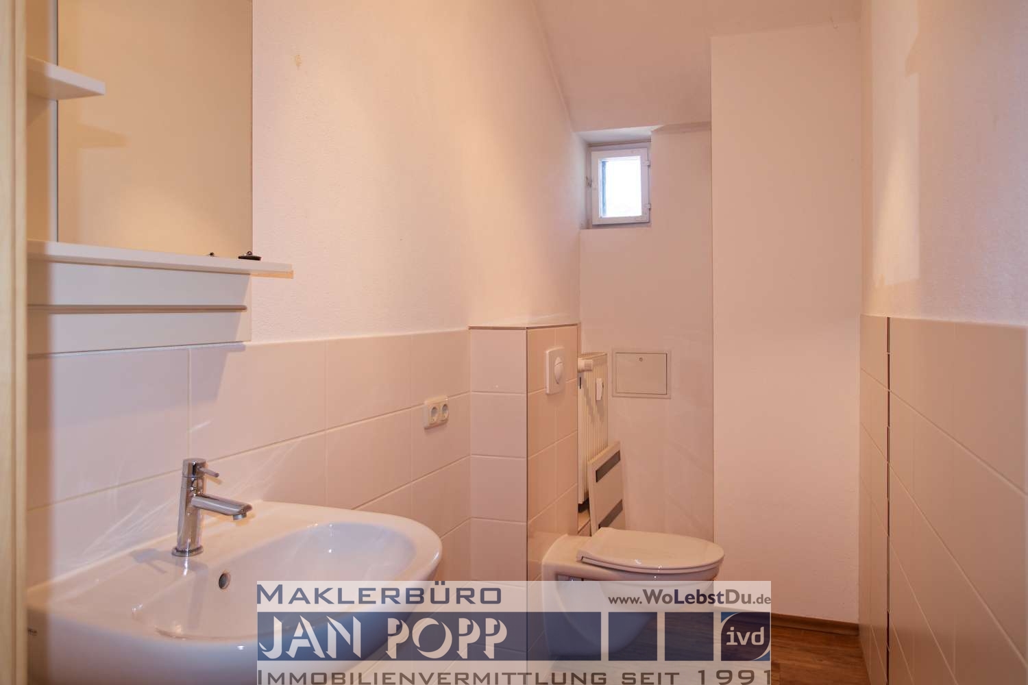 Geräumige, teilmöblierte Dreiraumwohnung mit Einbauküche im sanierten Altbau. Drei Zimmer, Küche Flur, großes Tageslichtbad mit Wanne und ebenerdiger Dusche, Gäste-WC.