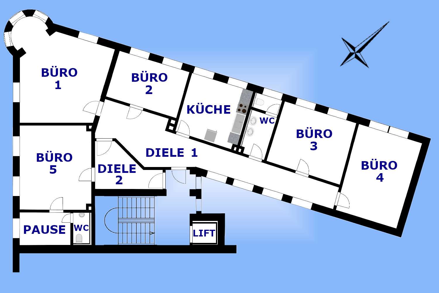Da zwei separate Eingänge vorhanden sind, wäre auch eine Teilung in ein 4-Raumbüro mit 108 m² (Grundriss: Büros 1-4, Diele 1, Küche und WC) und ein Büro mit 35 m² (Grundriss: Büro 5, Diele 2, Pausenraum und WC) möglich.