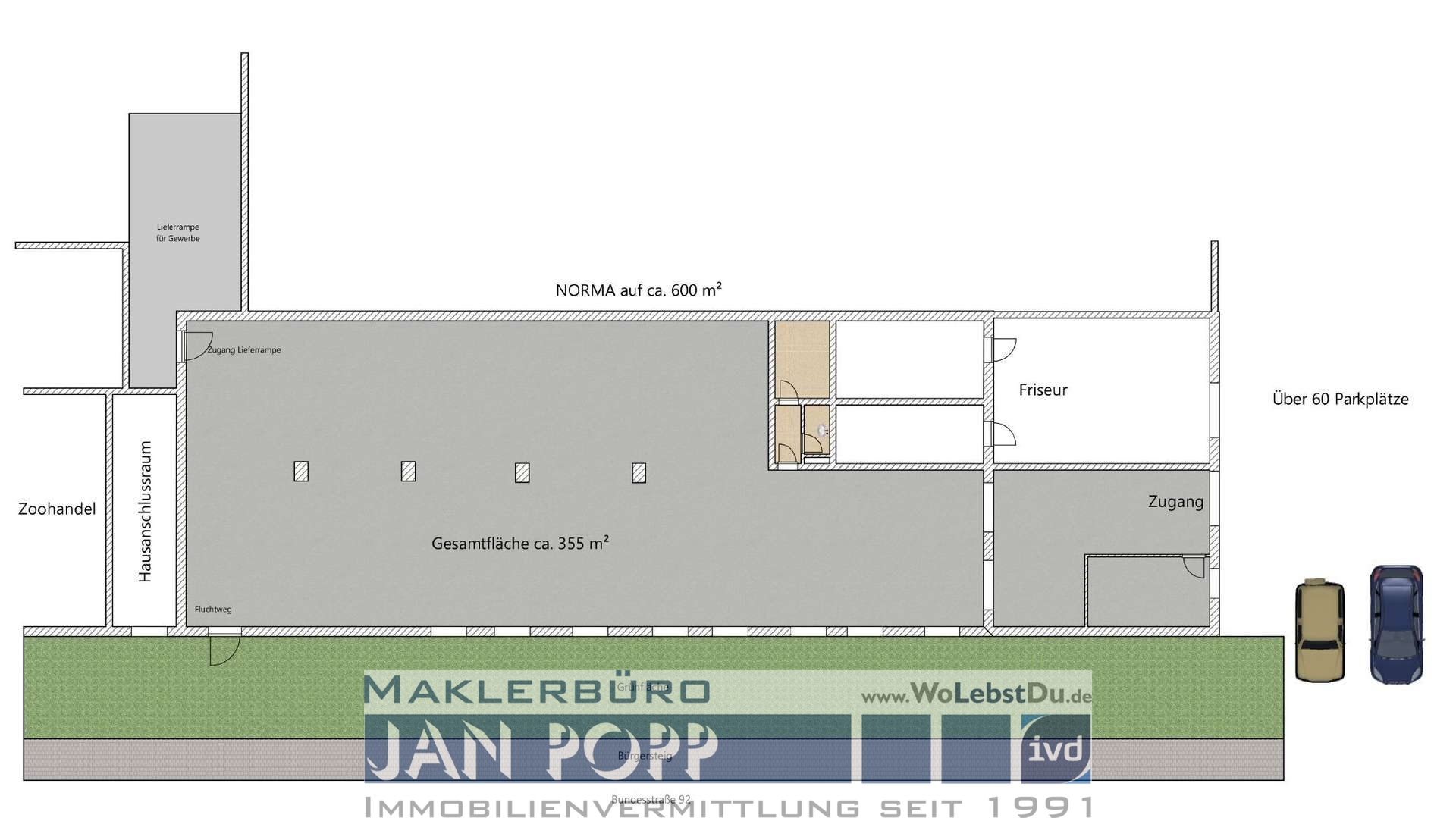 Direkt angrenzend befinden sich ein stark frequentierter NORMA-Markt sowie ein Imbiss mit Fischhandel, was zusätzliche Kundenfrequenz garantiert. Vor dem Haupteingang stehen über 60 Stellplätze zur Vermietung zur Verfügung – ideal für Kunden, Mitarbeiter oder Lieferanten.